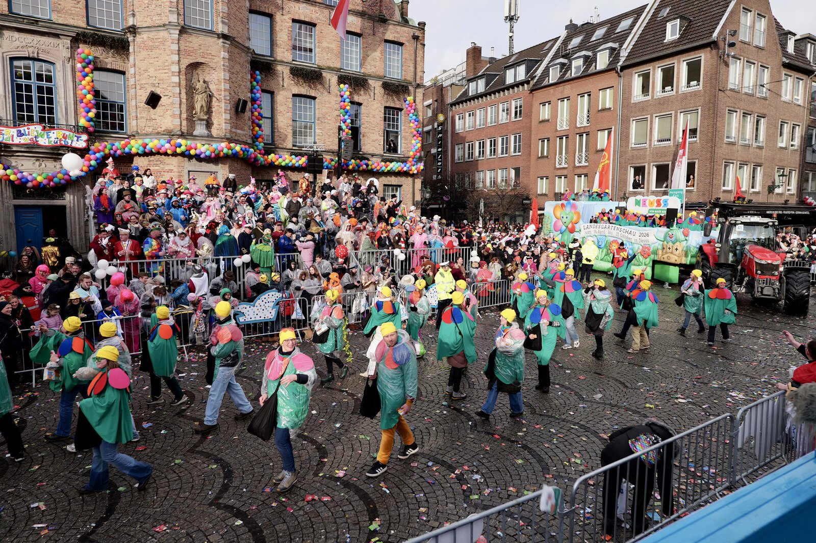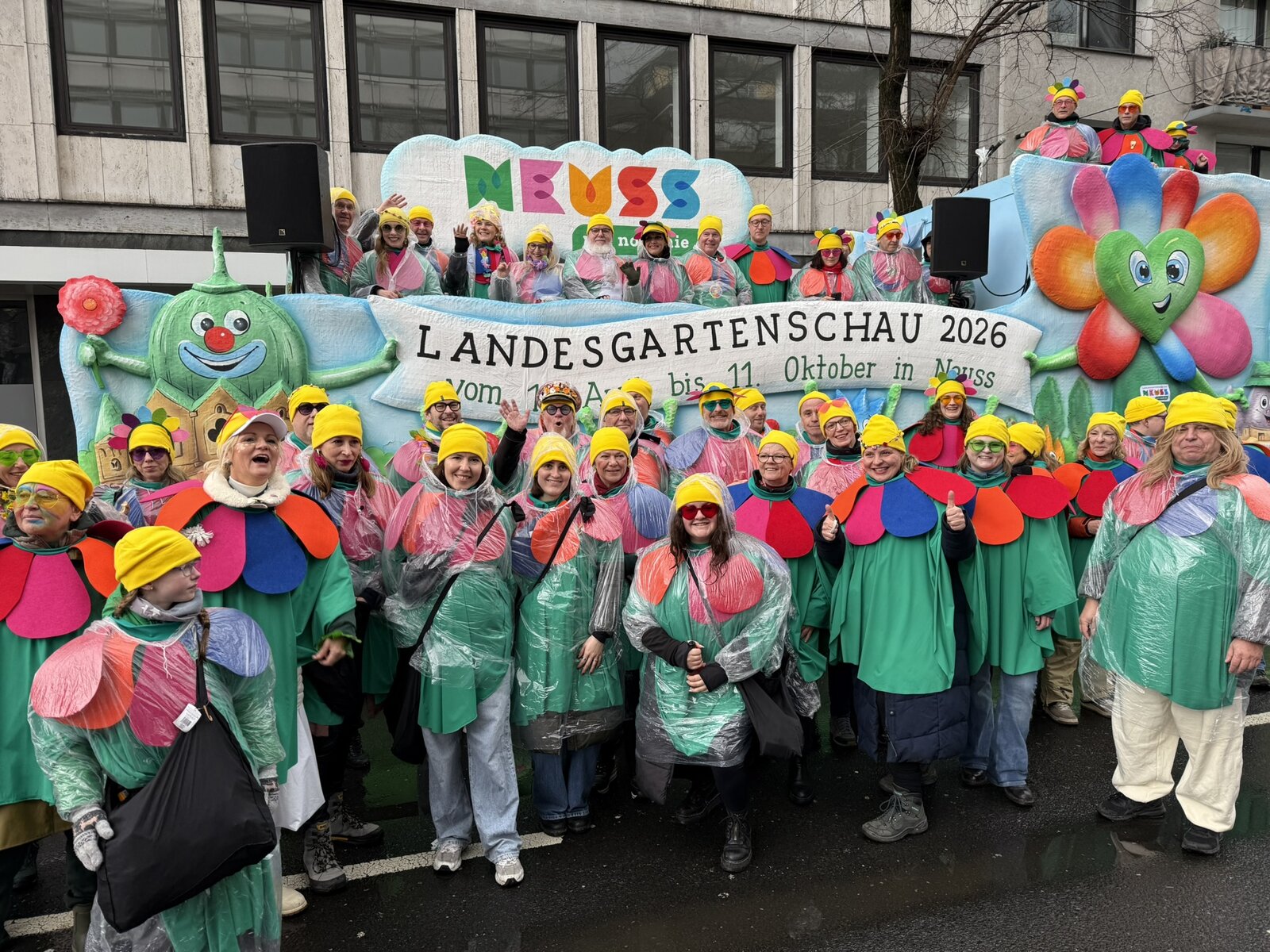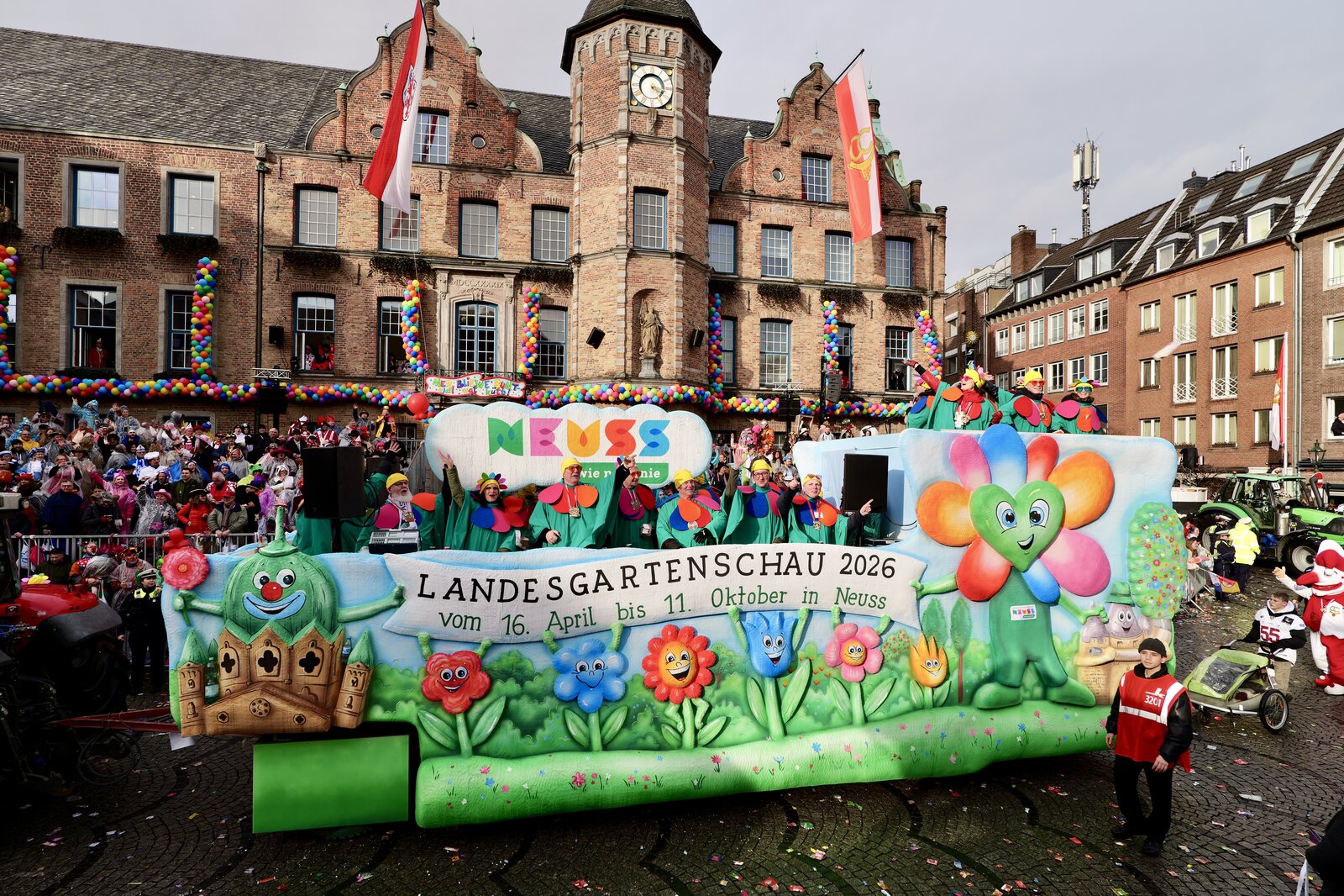 Am Rosenmontag war die Landesgartenschau Neuss 2026 beim traditionsreichen Düsseldorfer „Zoch“ dabei. Der Karnevalswagen startete mit der Nummer 41 und zog circa 5 Kilometer durch die Düsseldorfer Innenstadt. Die Teilnehmenden auf dem Wagen und die Fußtruppe sorgten für beste Stimmung und viel Begeisterung bei allen Zuschauerinnen und Zuschauern.